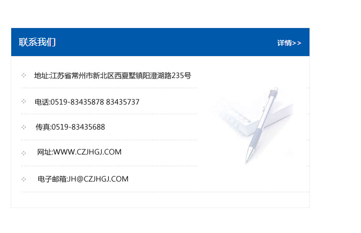 傳真:0519-83435688    郵編:213135    網址:WWW.czjhgj_com.luosi100.com    電子郵箱:JH@czjhgj_com.luosi100.com